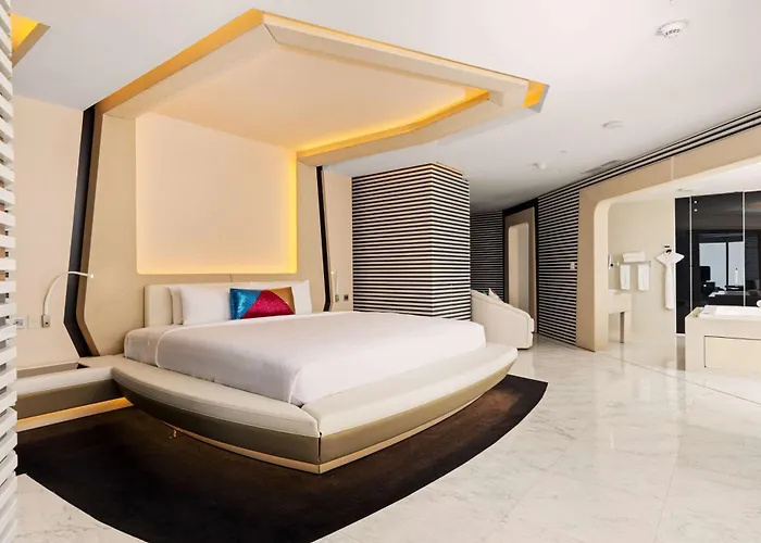 Das Hotel W Dubai - The Palm liegt im Stadtteil Palm Jumeirah und bietet eine schöne Aussicht auf den Persische Golf. Japanische Gerichte werden im hoteleigenen À-la-carte-Restaurant am Strand der Stadt serviert.